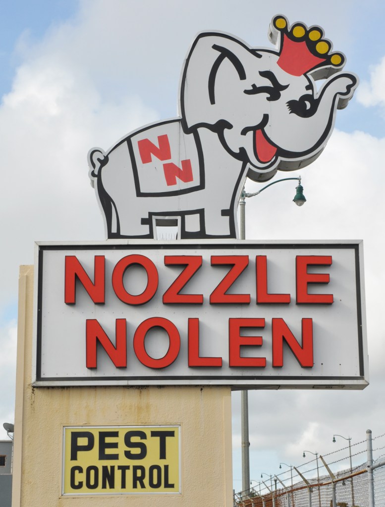Nozzle Nolen Pest Control in West Palm Beach was established in 1951. “Peanut” the elephant has always been the company’s mascot. This sign has been there since at least 1971. The text panel was updated at some point from a simple backlit plastic panel to this one with individual letters slapped on: