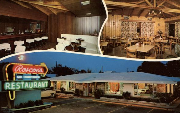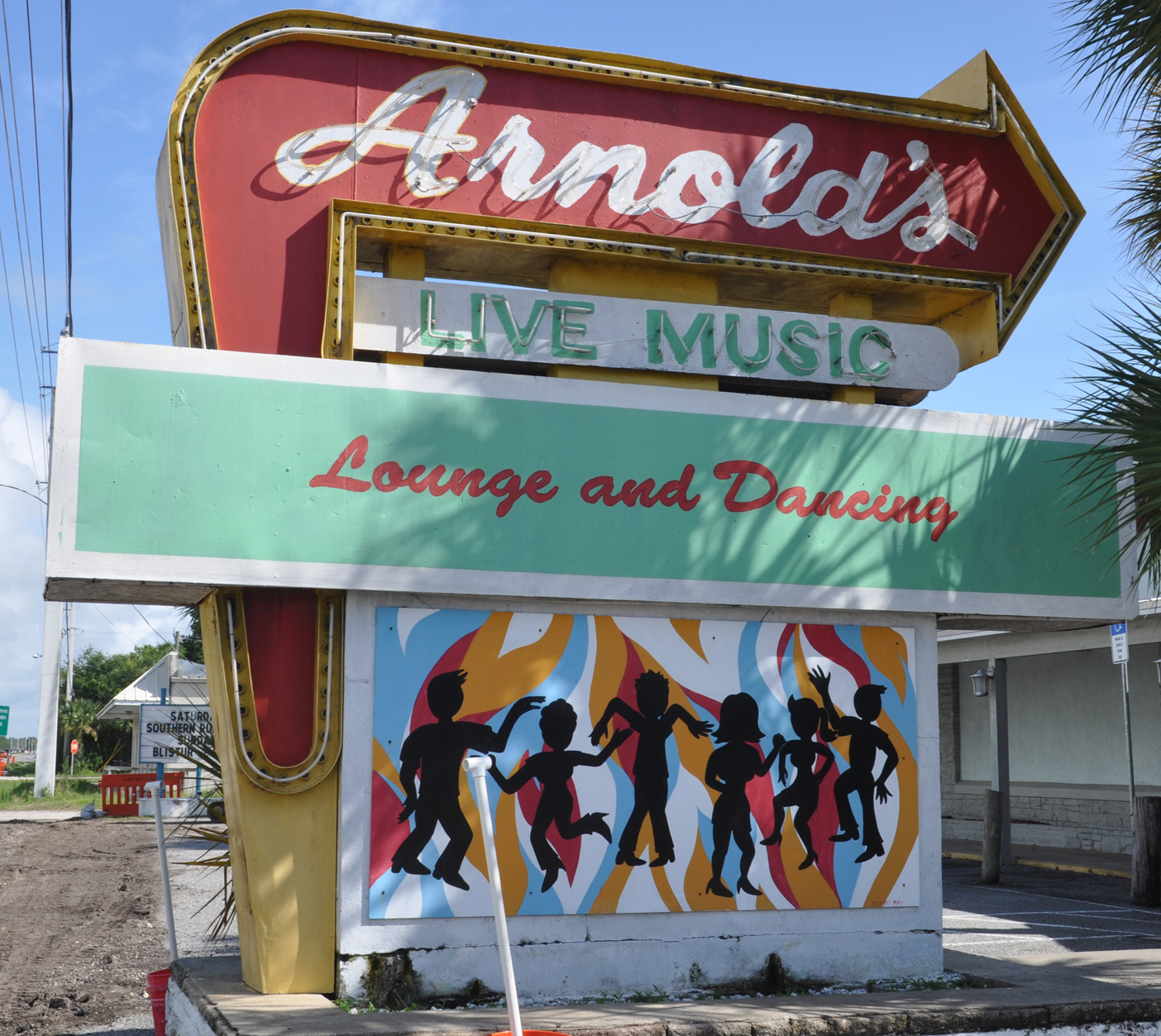 Let’s start with Arnold’s Cocktail Lounge in St. Augustine. The sign is in sad shape now. It was apparently inspired by the Holiday Inn “Great Sign” and originally advertised for Roscoe’s Restaurant: