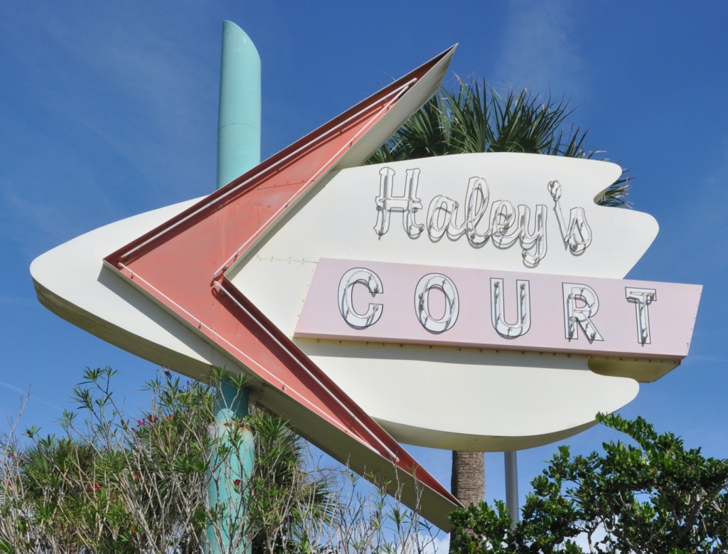 This sign for Haley’s Court in Vilano Beach is a real mystery. I’ve done a lot of internet pounding about this one. There are vintage postcards of the original sign which had a simple, 1940s design. It’s a crude and tiny image but there it is with its rounded panels, small top & bottom, and bullnose neon on the sides: