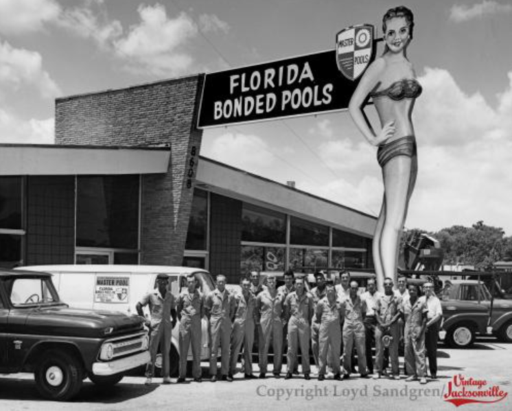 The former Florida Bonded Pools sign in Jacksonville has been updated quite a bit since the store opened in 1957. This great article describes and shows the original sign with a giant representation of Esther Williams: