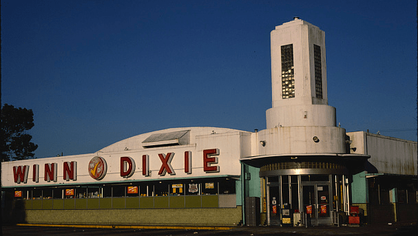 This former Lovett’s Food Store in Jacksonville was built around 1947. It later became Winn-Lovett’s and later Winn-Dixie. Here’s a John Margolies photo from 1979: