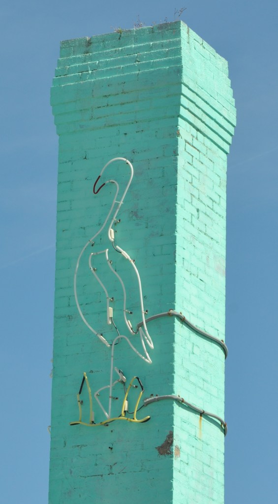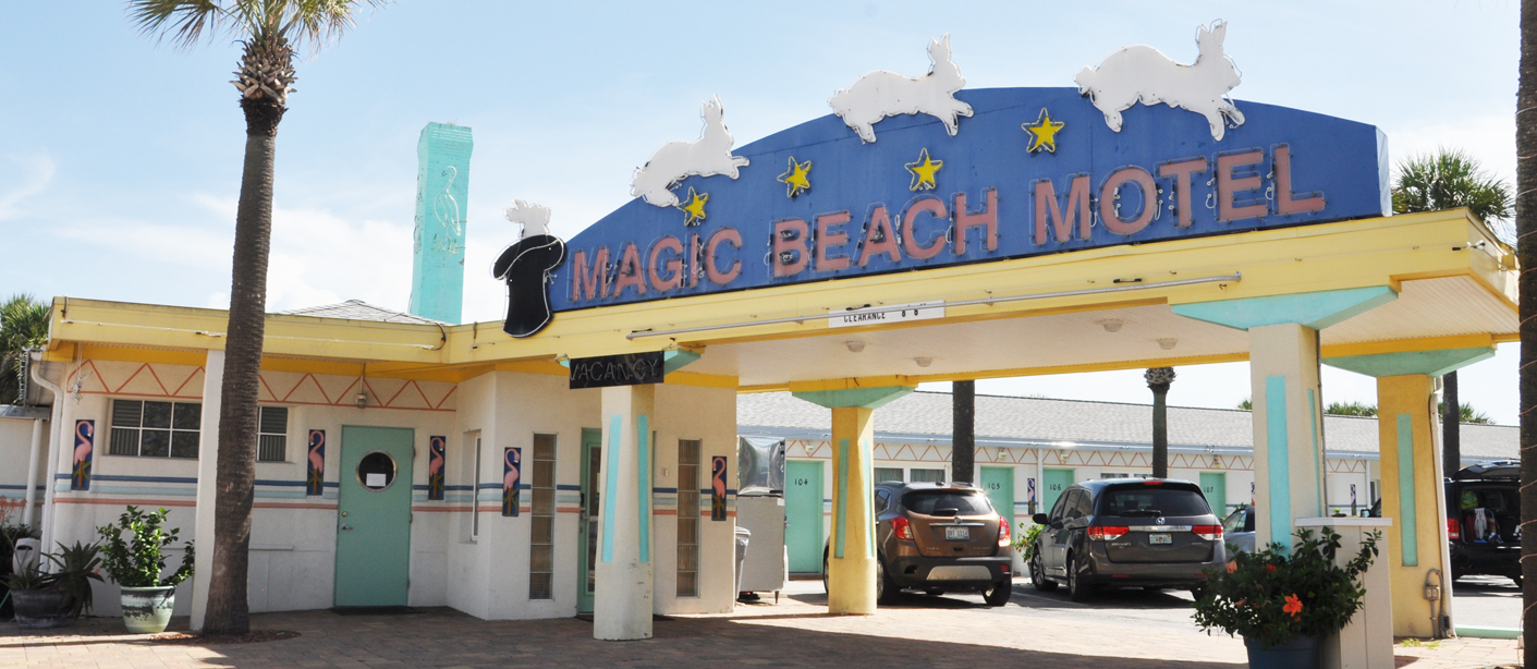 The Magic Beach Motel in Vilano Beach was built in 1951 as the Vilano Beach Motel. This sign was built in 1999 for the Safe Harbor TV show. The motel kept the sign and changed their name then. Earlier this year, the motel was sold to a developer and this will all be gone soon. Including the relief sculptures of flamingos on the office and the neon flamingo on the chimney: