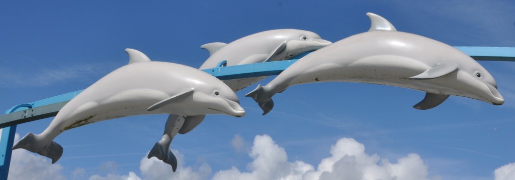 These fiberglass dolphins in Vilano Beach are installed on the pier just behind the Bluebird of Happiness statue: