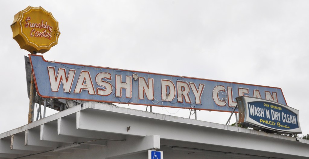 This laundromat in Jacksonville was part of an early 1960s nationwide chain of Philco-Bendix Wash ‘N Dry Clean Sunshine Centers. The vacuum-form sign on the right was mass-produced but I believe this rooftop neon sign was a one-off.