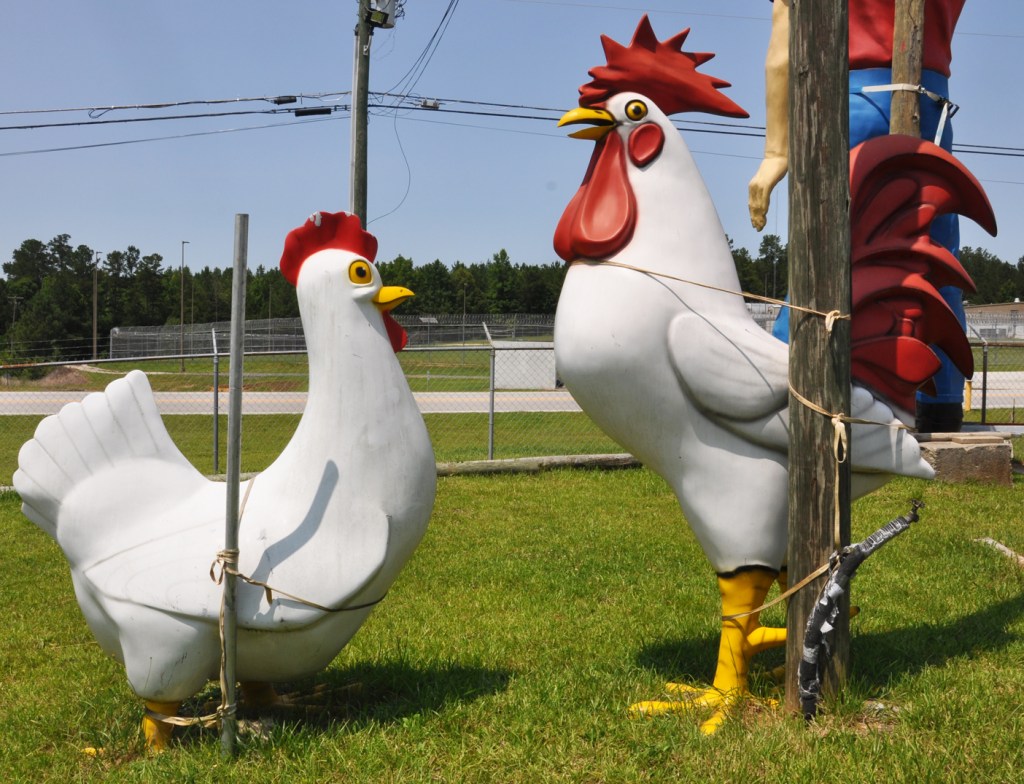 Fiberglass statues abound at Atlantis Plumbing in Dallas. The owner got bitten with the bug and acquired a lot statues from Magic Forest in Lake George, NY when the new owner changed themes. This is an opportunity to really see the size and style differences between what I call the “smooth” chicken and the “classic” rooster. International Fiberglass made the classic statues in the 1960s and there are still dozens of them all over the country. They are now replicated in aluminum (easy to spot since they have a lot more feathery detail). I don’t know what company made the smooth variety but there are only a handful of them out there on public display. I’ve got five pages of chickens alone in my Animal Statue section: