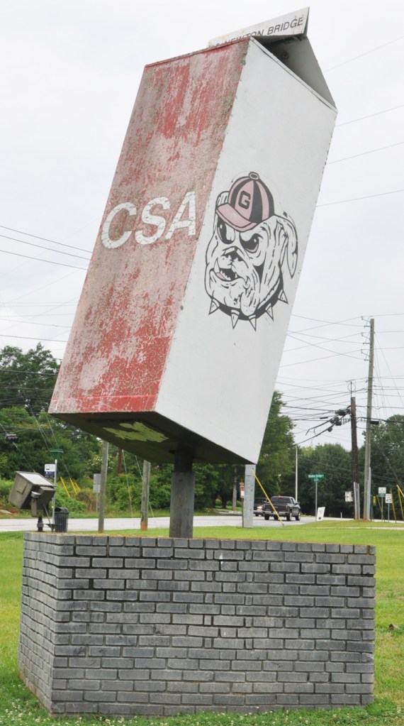 This giant milk carton is also in Athens. Usually, these were installed at dairy plants. This one was actually installed at a milk carton manufacturer. The company is gone now but they named the road after the plant (Dairy Pak Rd.) and I’m so glad they have kept the carton. Lots more of these at my website here: