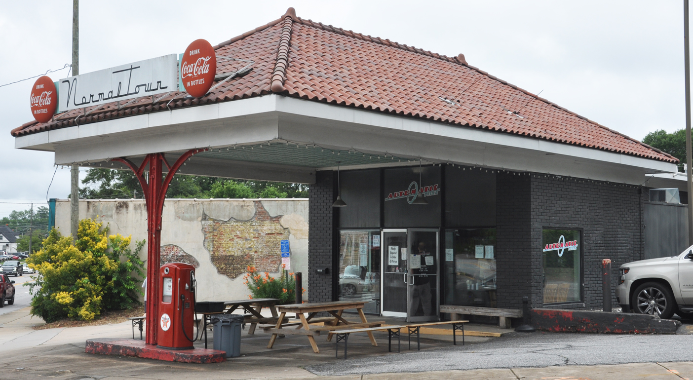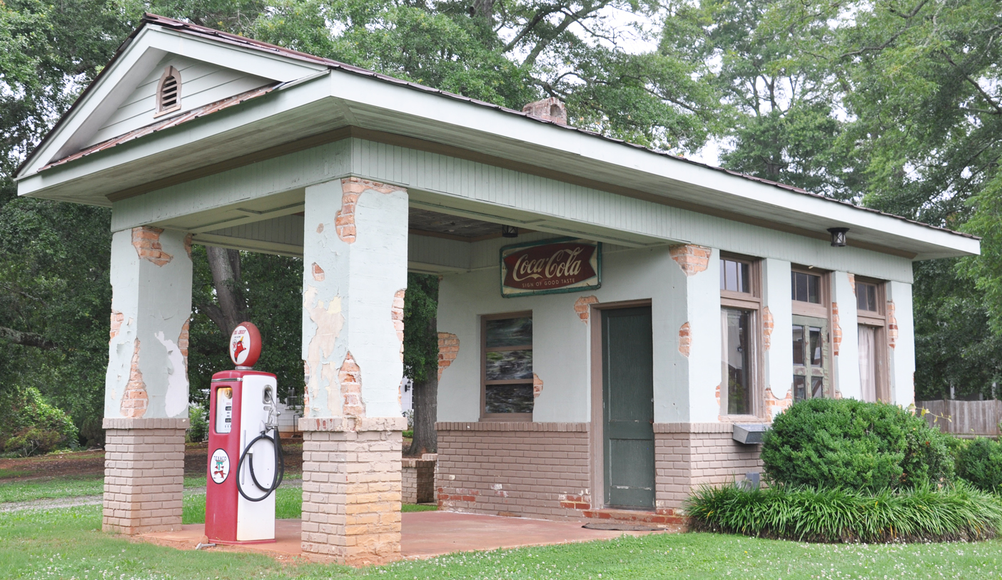 This gas station building in Watkinsville is pretty convincing. However, I believe it was built from scratch. There was nothing on the property but trees in 2008. The randomly but regularly-placed exposed brick and weird roof that hangs over the entire building are clues: