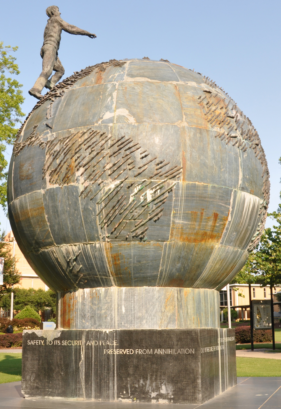 This globe sculpture entitled “Spaceship Earth” at Kennesaw State University (in Kennesaw) has really fallen on hard times. It was installed in 2006 and it has fallen apart at least a couple of times. The earth was a very pretty blue originally. Lots more globes at my website here: