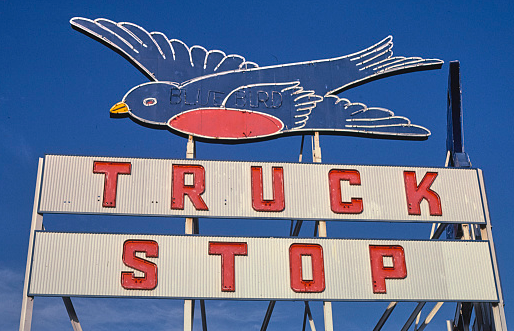 The Blue Bird Service Center in Atlanta was built in 1939. There were three giant bluebird signs then: one on the front of the building and two on the roof with two triangulated panels reading “Truck Stop” from the backside. Nick Fisher shot it in 1990 – https://www.flickr.com/photos/10386678@N02/955798540
