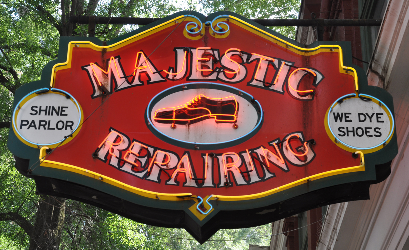 The Majestic Shoe Repair store opened here in Atlanta in 1951. This sign is probably from then. The store is long gone but there’s a restaurant below (Brickstone Cafe) that must be footing the bill to keep the neon working:
