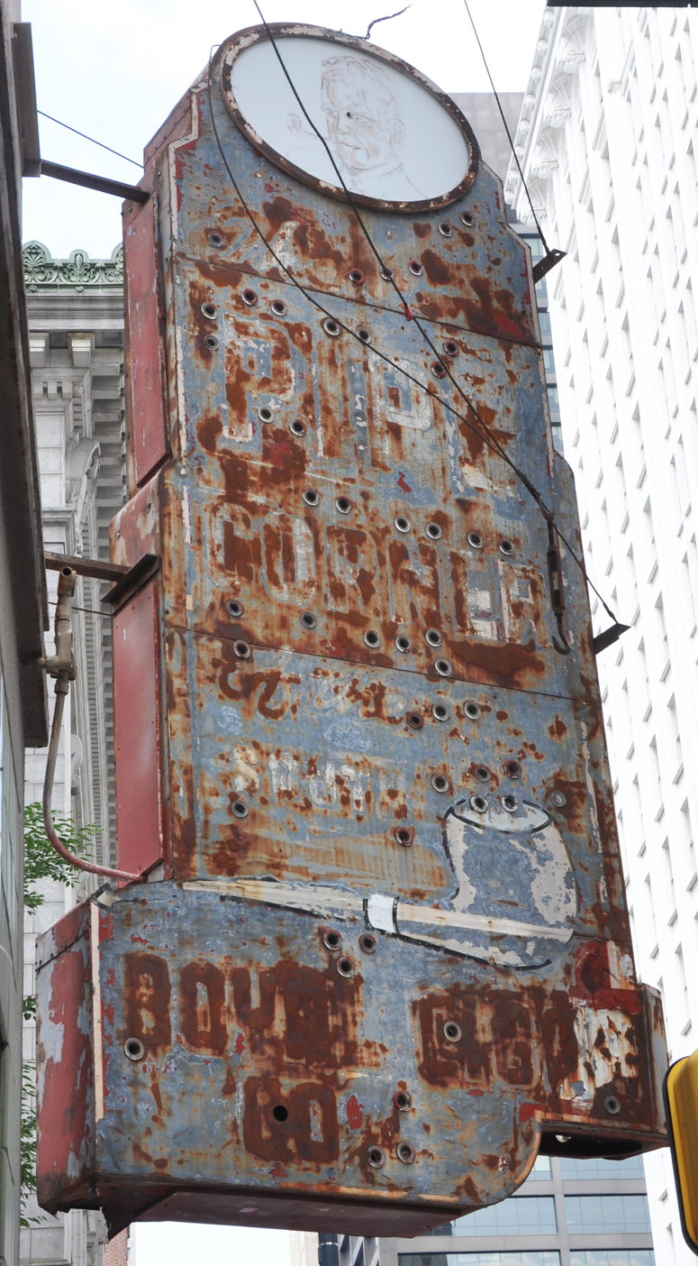 The Pipe Corner sign in Atlanta is another ripple tin sign. It’s been there since at least 1952. The ghosted bottom reads “Royal Cigar Co.” In 2015, there was a scare that the building was going to be demolished and the sign’s fate was unknown. But the building is still there and the sign is safe for now: