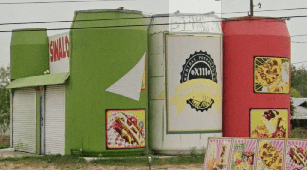 The Giant Six-Pack of Beer in Laredo, TX has been repainted many times over the years. Here’s what it looked like when it was vacant in 2018: