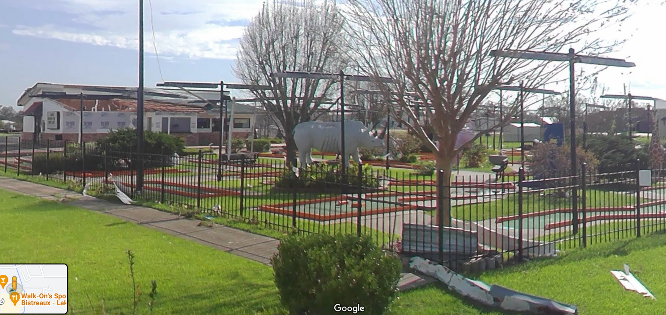 The Putt-Putt in Lake Charles, LA got hit by two hurricanes in 2020 but they are back in action. Here’s StreetView soon after the hurricane. It looks like the roof of the building on the left was badly damaged: