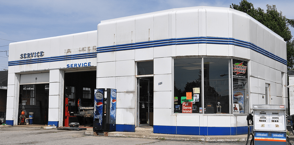 This former station in Cedar Rapids, IA housed a hair salon for many years. When the sign was removed recently, it revealed the Art Deco “oil products” letters: