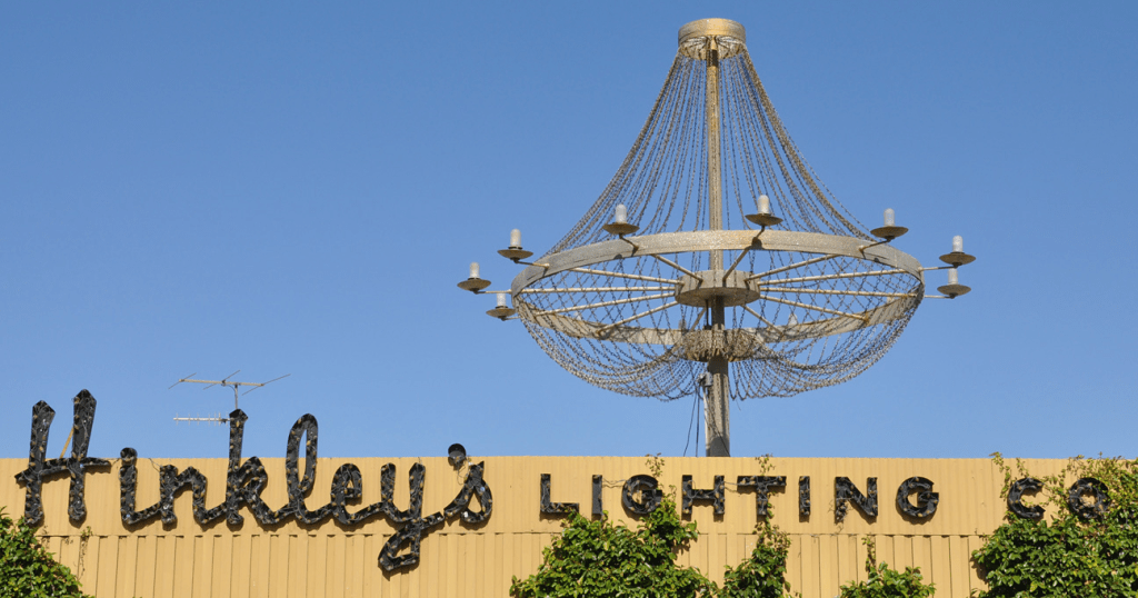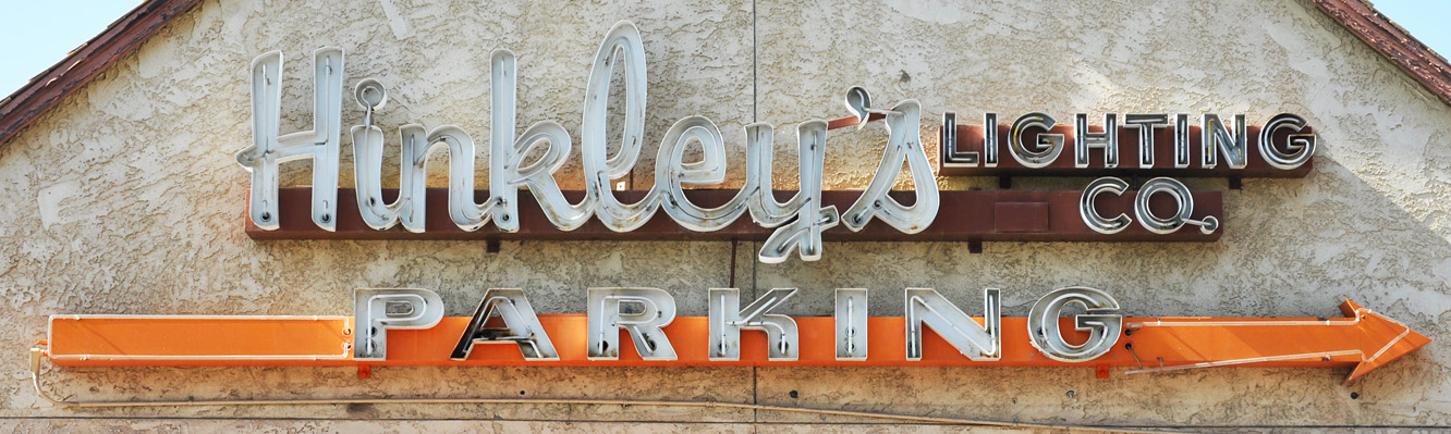 Hinkley’s Lighting in Phoenix, AZ closed that location last year and has been moving their stock to the Scottsdale location. The signs have been removed and are now at one of the company’s warehouses. The giant, bulb-festooned rooftop chandelier is still there for the now while the owner decides what to do with it.
