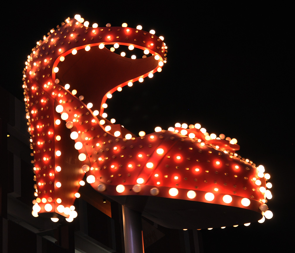 The Ruby Slipper on East Fremont in Las Vegas was removed recently. It was modeled after the Silver Slipper sign and built in 2007 for the City of Las Vegas. I assume that it’s in storage somewhere. I can’t find anything about it online. The Silver Slipper sign was restored by The Neon Museum and is installed in the median next to the museum: