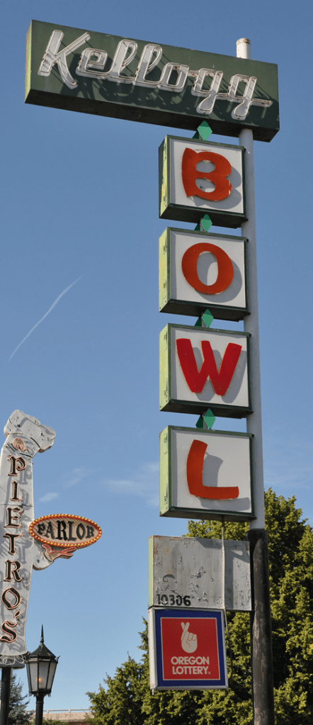 The Kellogg Bowl in Milwaukie, OR closed in 2020. This sign is gone now (just the pole remains):