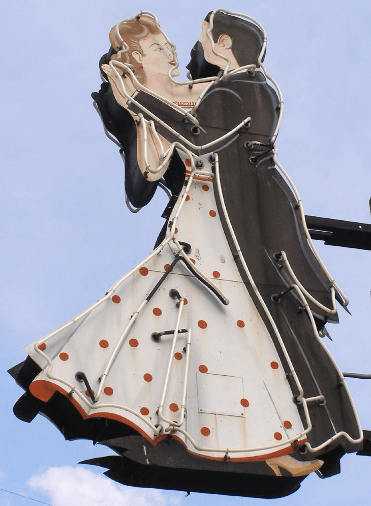 has been adapted slightly with surrounding panels and the female dancer now has an arm extending to support a pizza: