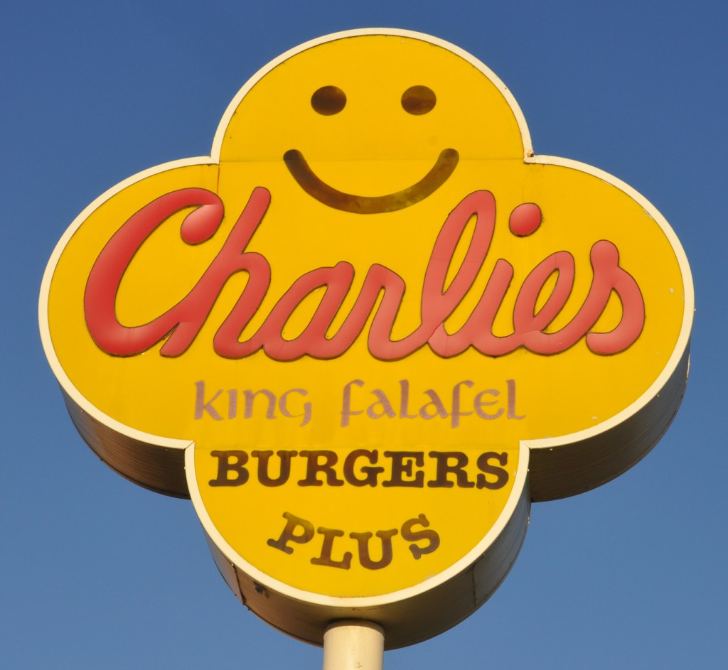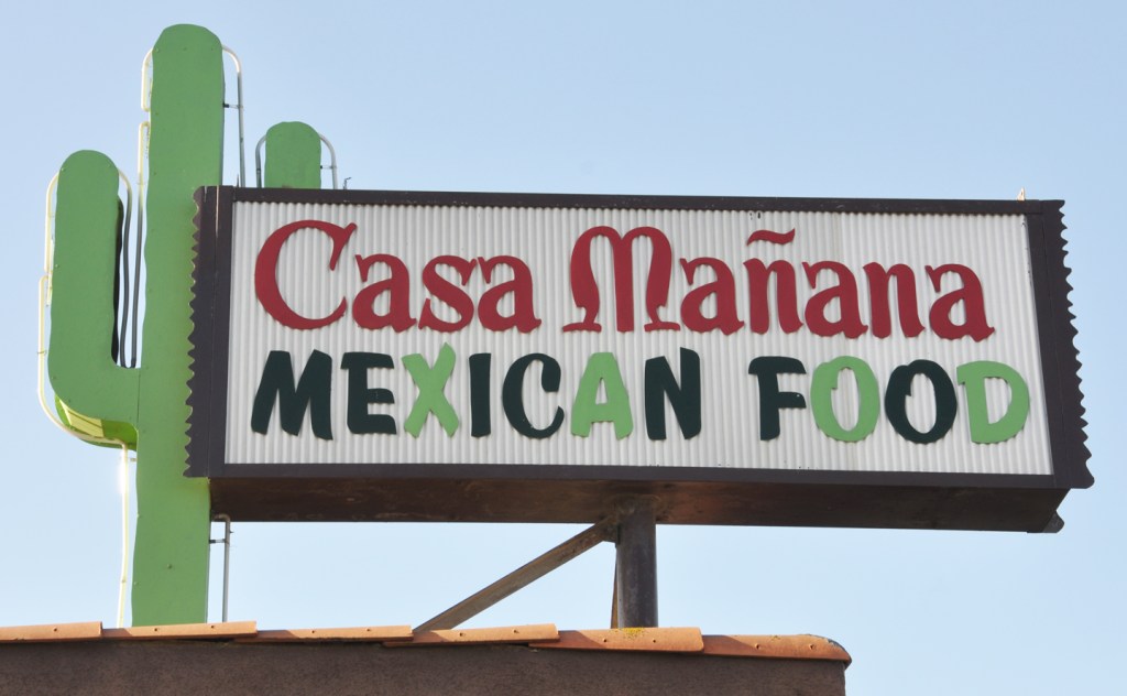 This nifty sign in Santa Maria has, yes, a fun saguaro but also corrugated plastic (fiberglass?) panels and stick-on letters which are getting really rare now. Usually, the letters fall off and these guys get replaced with flat, backlit plastic panels.
