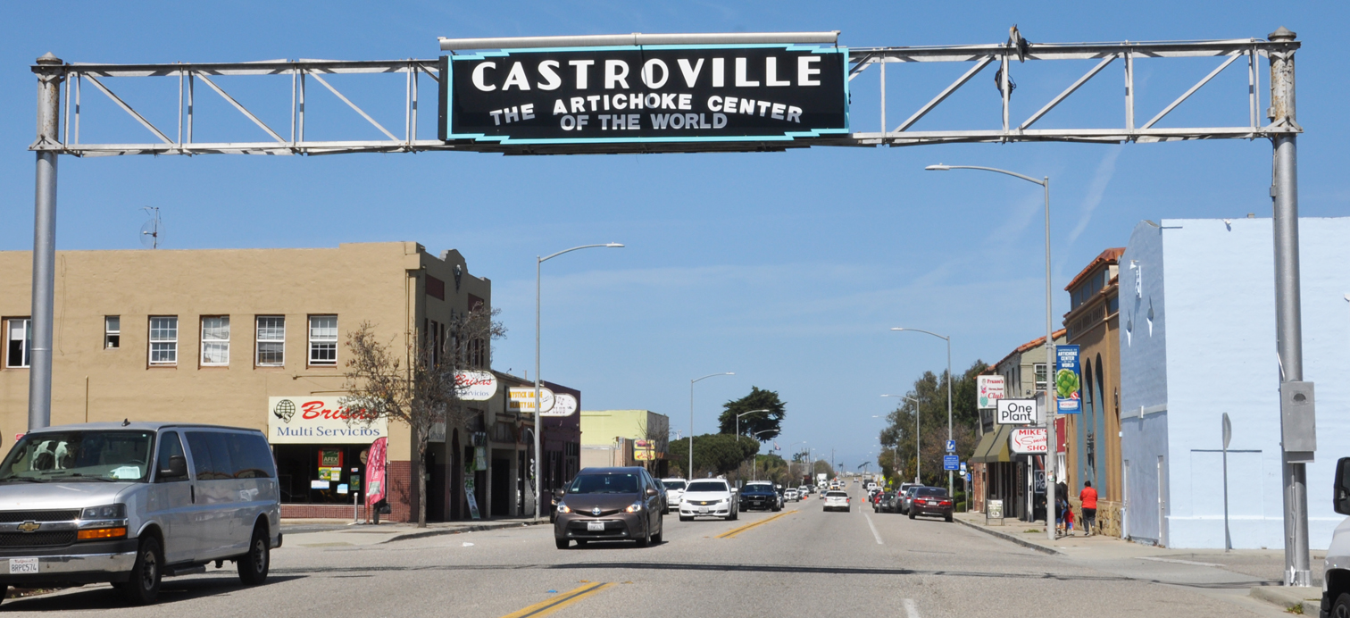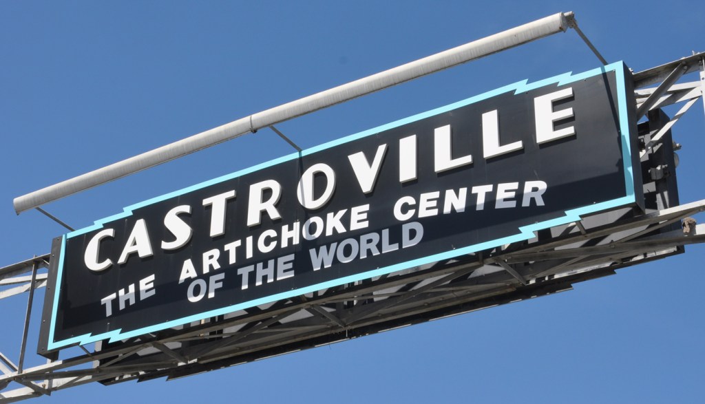 Let’s close this post with a welcome arch sign in Castroville (Gator on the left says “hi” – and Orbit poses on the dash):