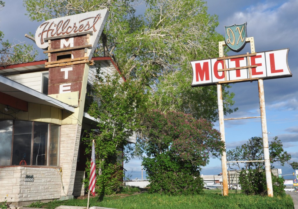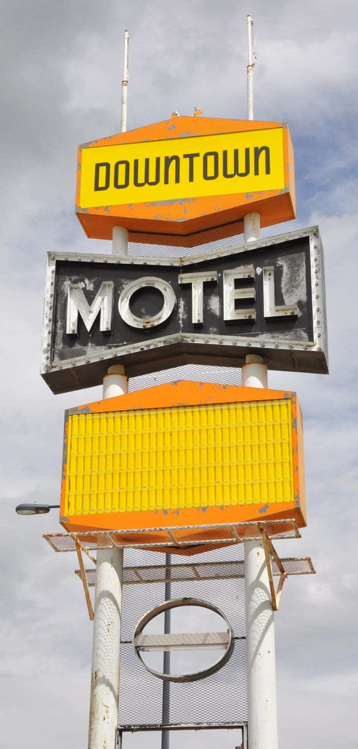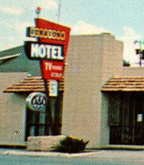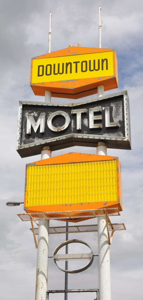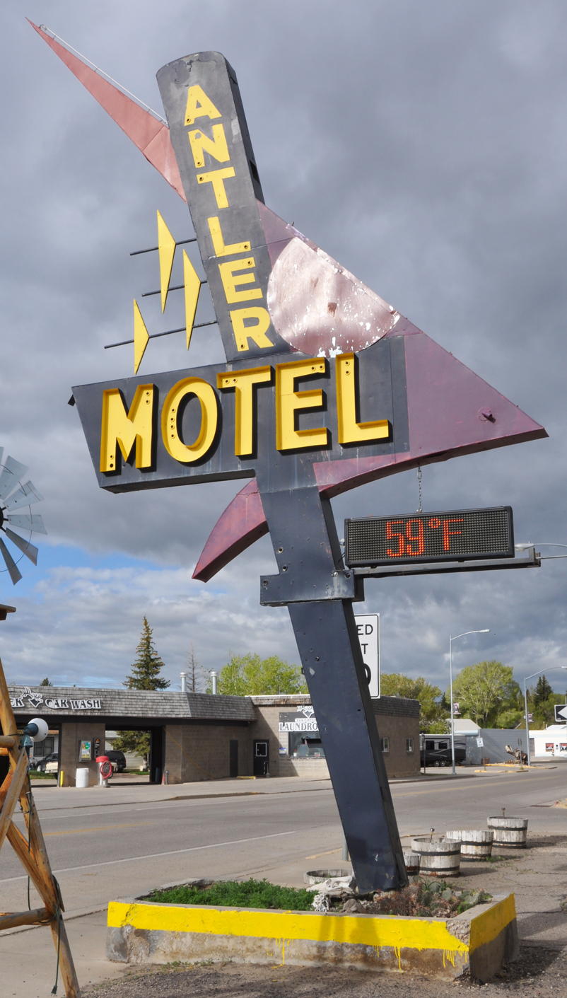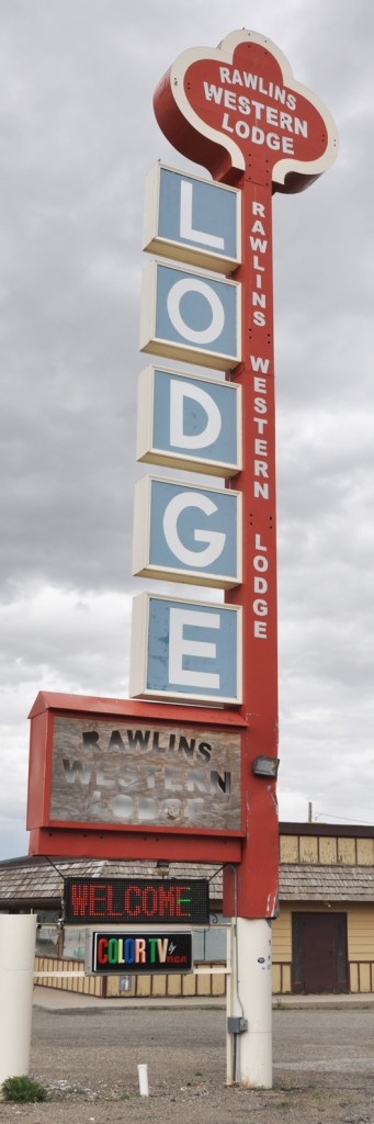 This sign in Rawlins is shaped like a giant motel room key (remember, before we used plastic access cards?). No postcards that I could find but I’m betting there was neon on the key and maybe different text. Note that this one still has the vacuum form Color TV sign at the bottom: