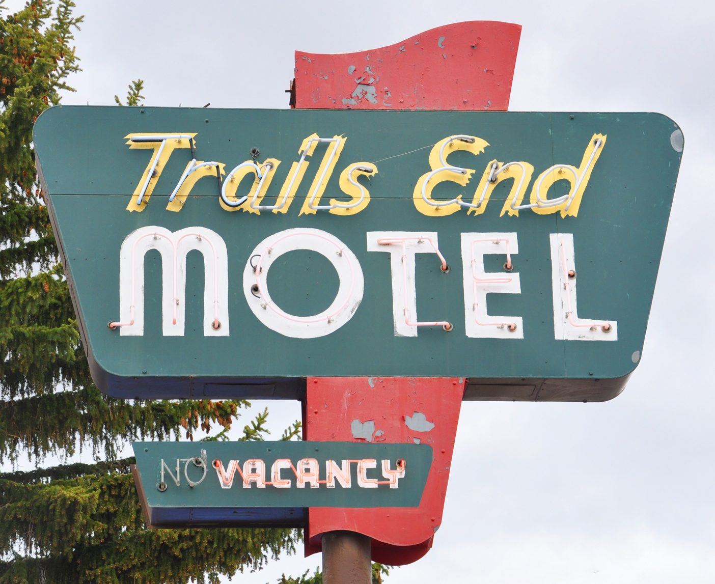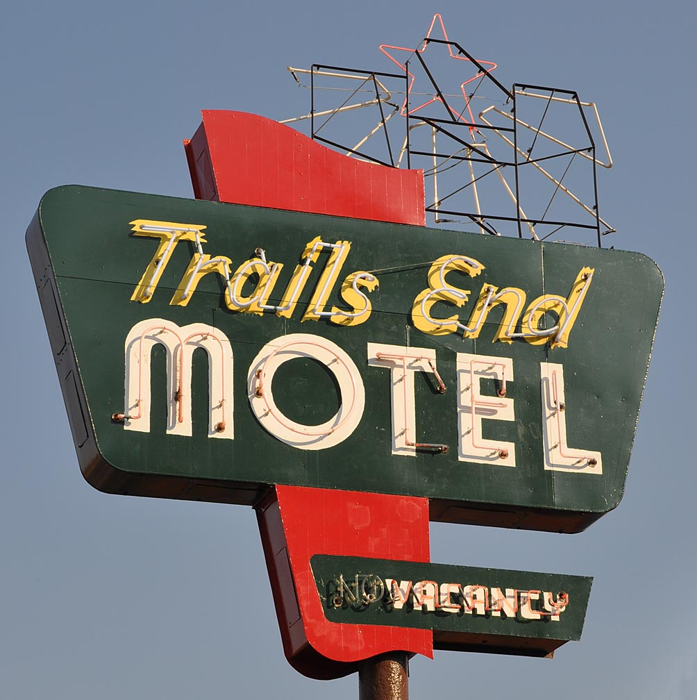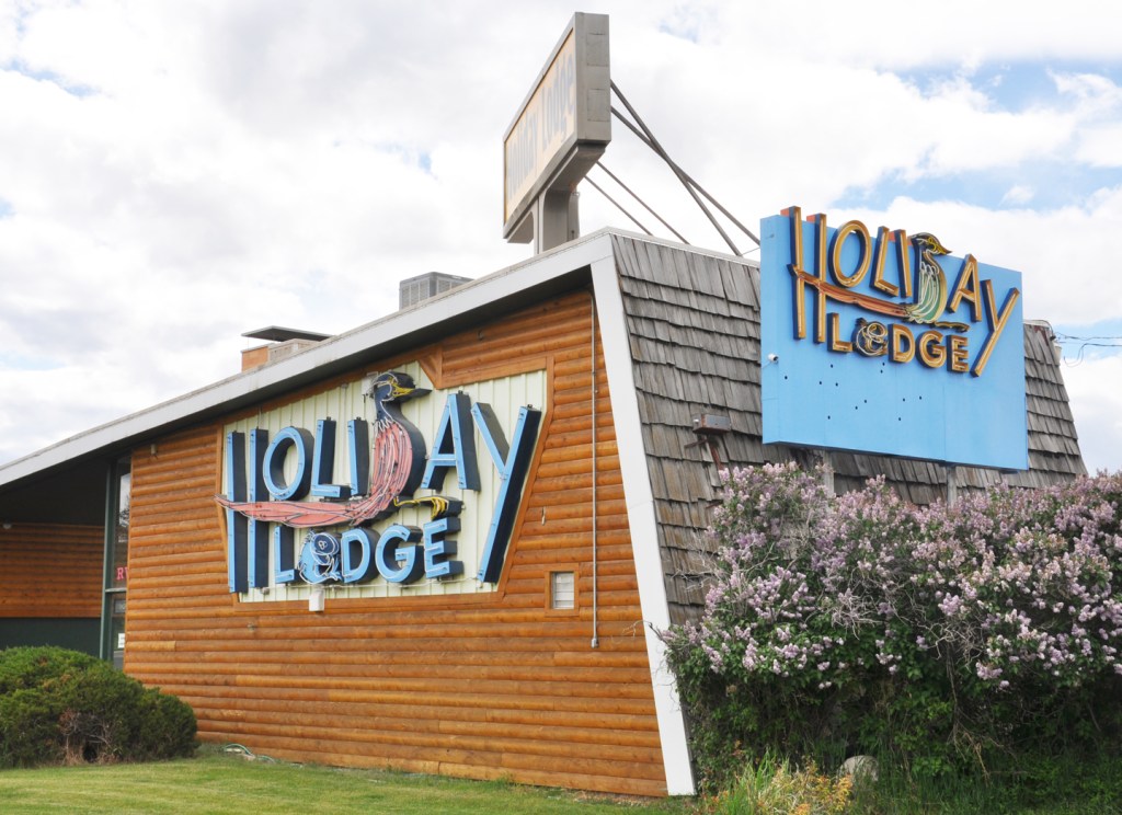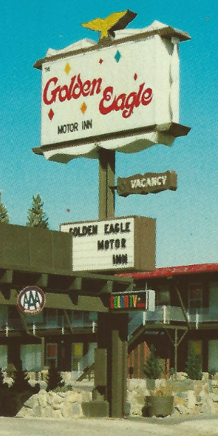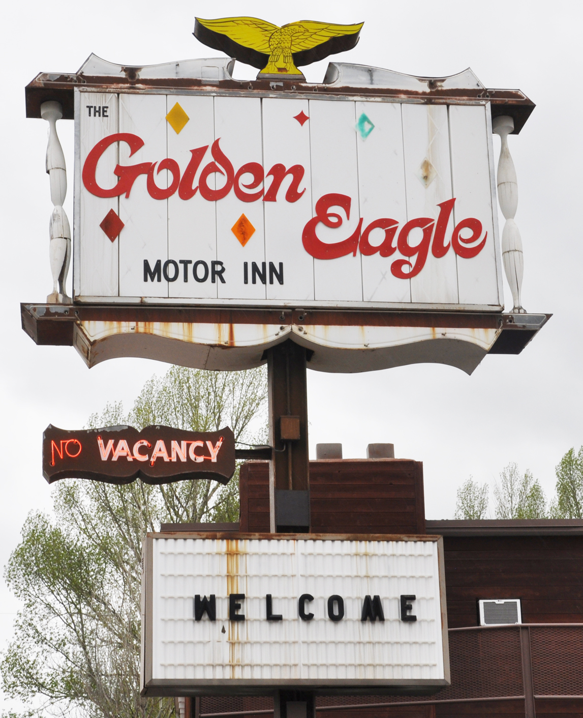 This sign in Rawlins is shaped like a giant motel room key (remember, before we used plastic access cards?). No postcards that I could find but I’m betting there was neon on the key and maybe different text. Note that this one still has the vacuum form Color TV sign at the bottom: