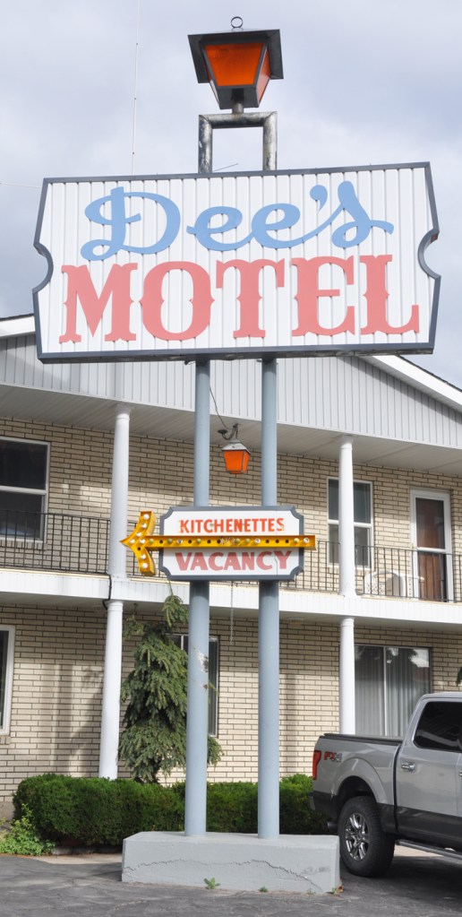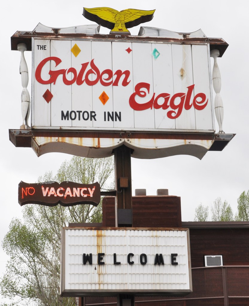 Also Kemmerer. The neon’s been removed and so has the plastic circle with the deer (that partial circle on the panel). Purple is an interesting paint color — previously red and black. I love a deliberately leaning sign. Does that instinctively catch the driver’s attention as if it were possibly a falling object?:
