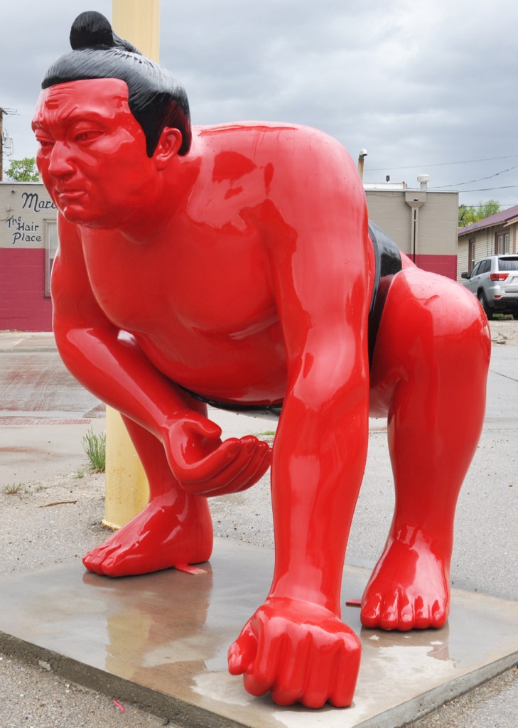 This fiberglass Sumo Wrestler statue in Rawlins is one of a few in Wyoming and Colorado built for Sapporo Japanese Steak Houses. I think this Ichiban Japanese Steakhouse got this guy from a closed location: