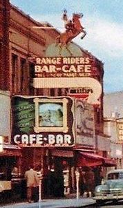 Skipping ahead to recent years… this Google Street View map shows what the two buildings look like now. The Trails Inn Bar and its horizontal sign had already been there for decades. In 2009, the two businesses were consolidated and the projecting sign with the horse & rider was adapted with the new name and moved to the right, next door. A few years later, the Range Riders Cafe opened in the vacant space on the left: