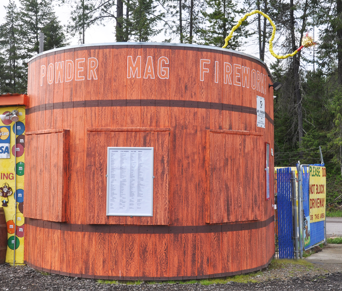 A giant gunpowder barrel at a fireworks stand in Haugan: