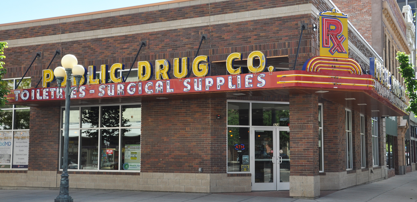 This drug store was destroyed by fire and a new building was built nearby. Fortunately, the signs were saved and restored: