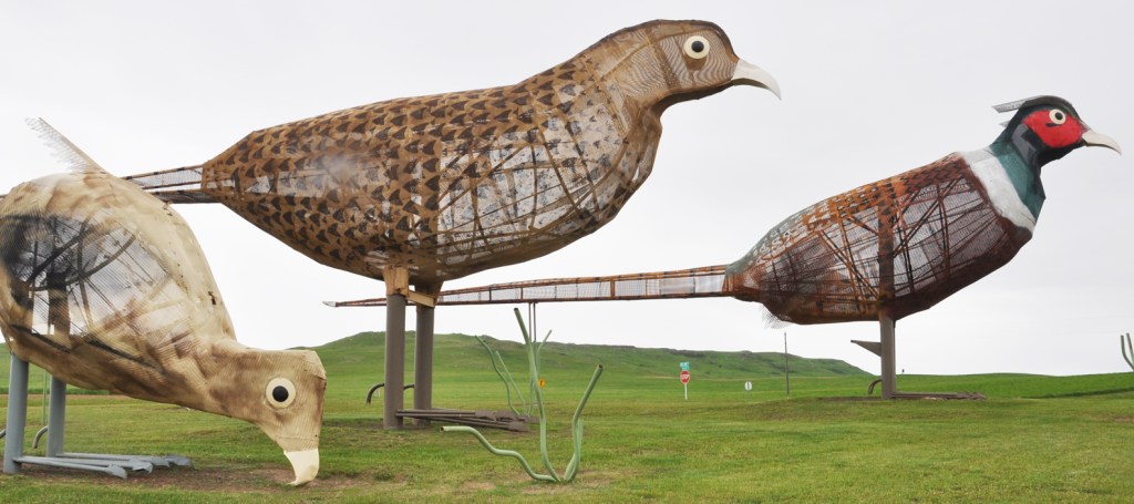 This wolf sculpture in Lemmon, SD was created from scrap metal by John Lopez who has some other impressive cowboy sculptures in town (and elsewhere):