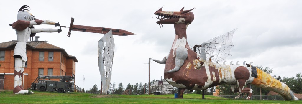 This “Waiting on the School Bus” sculpture in Glendive, MT was installed around 2017 in front of the Dawson County High School: