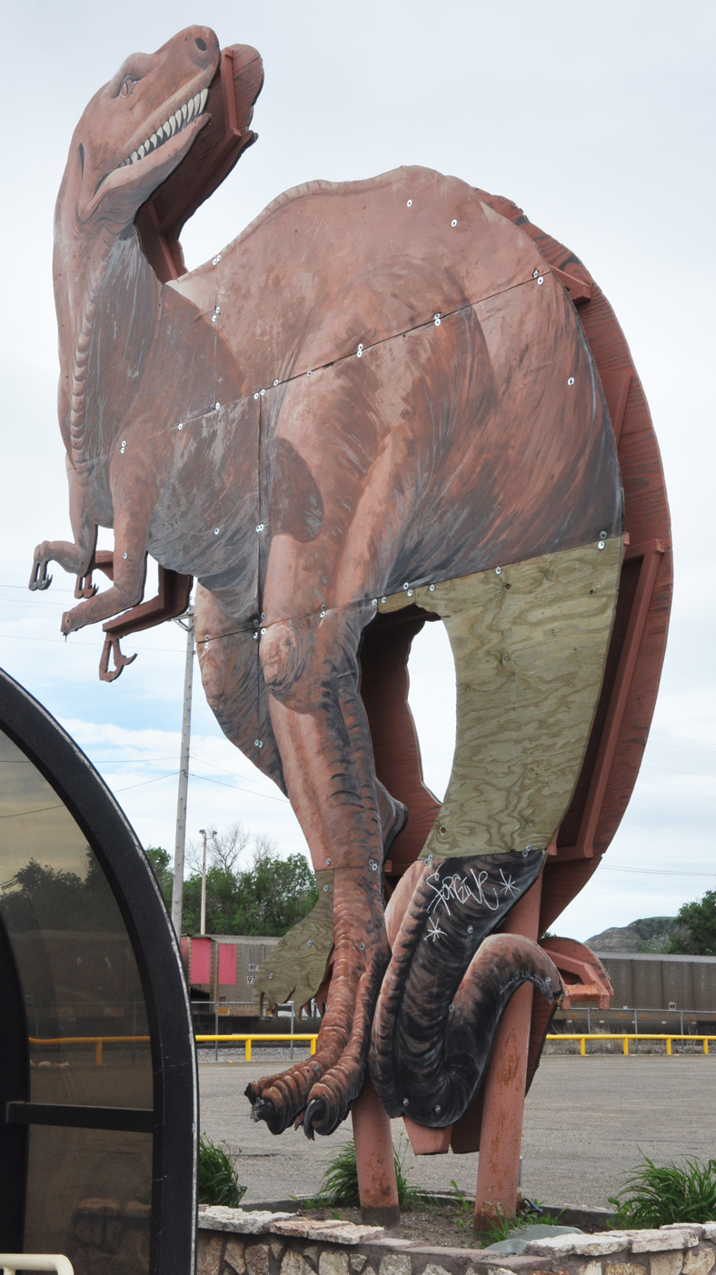 This painted plywood T-Rex sign in Glendive, MT was built in the early 1990s. The city is now fundraising to restore and repaint it, and possibly add LED lights: