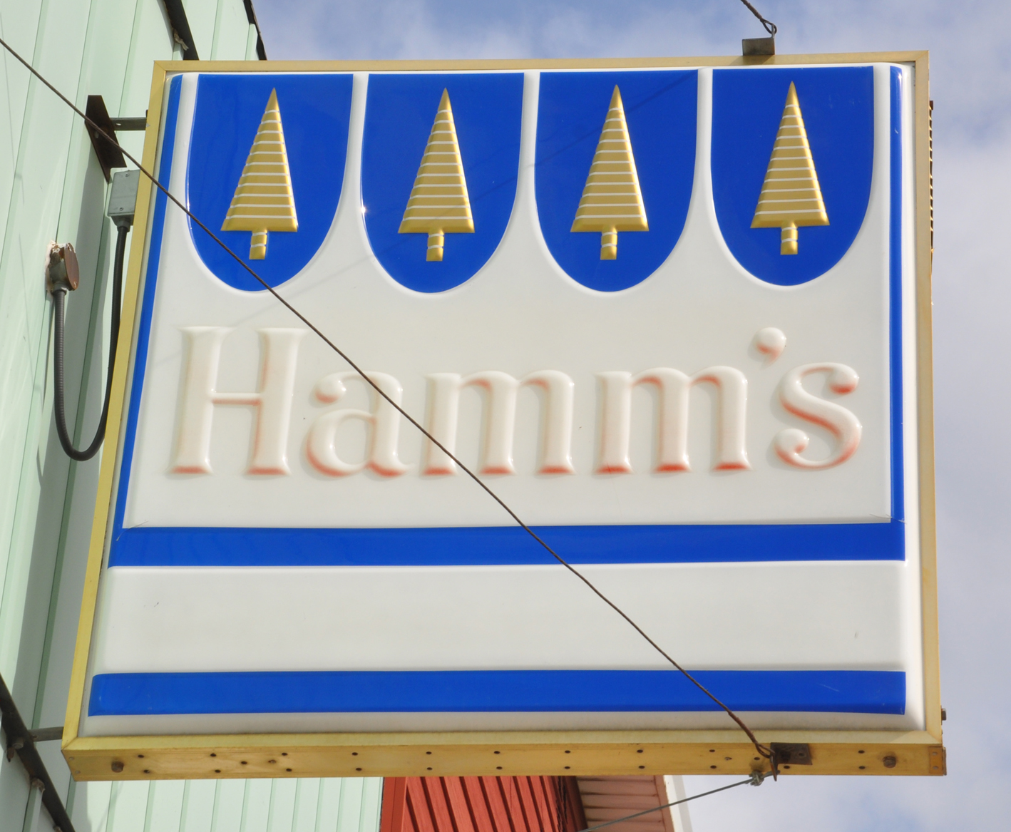 Let’s start with a couple of signs from Hillsboro, ND. This faded plastic sign at Tap That Bar. The Hamm’s letters would have been red originally and the bar’s name would have been in the white stripe at the bottom: