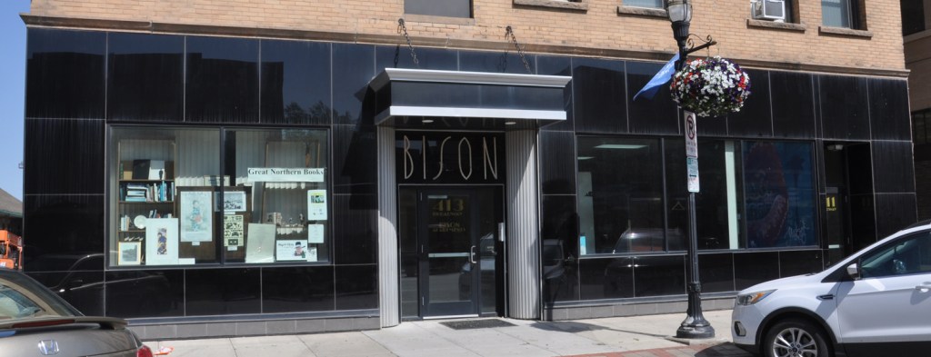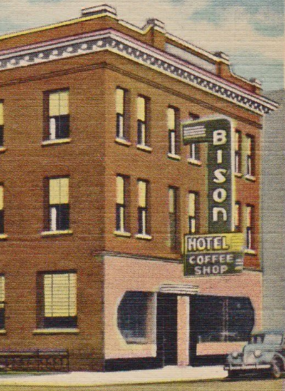 Moving on to some buildings – a couple from Fargo. The Bison Hotel was built in 1905 as the Viking Hotel. In 1940, it was remodeled as the Northern Hotel. Soon after, it became the Bison Hotel and this blade sign was installed (gone now). The ground floor looks like it had pink tile then:
