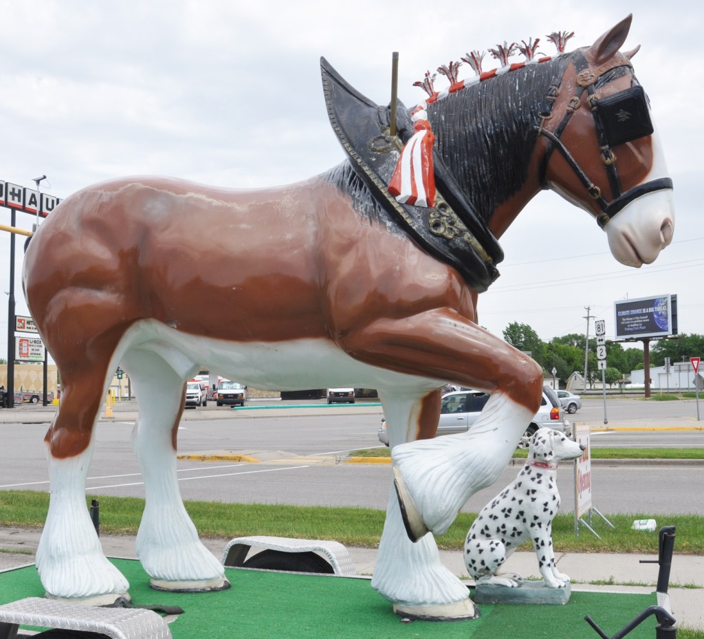Let’s close with a couple of statues. A classic fiberglass Clydesdale in Grand Forks from the 1960s or so. Installed earlier this year at the Rock Bottle Shop with a little Dalmatian pal: