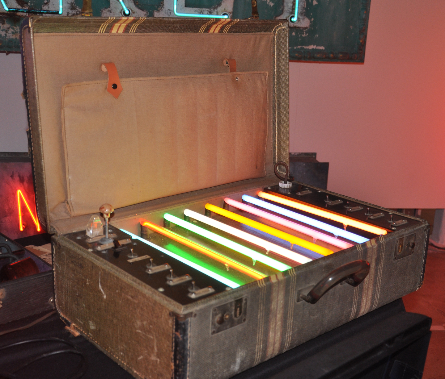 The Curiosity Lounge was fun. Lots of neon-loving friends from all over the country came. Chris Raley came down from Fresno with a collection of his miniature sign replicas. Dydia DeLyser & Paul Greenstein brought some new and old things — including this neon salesman’s suitcase:
