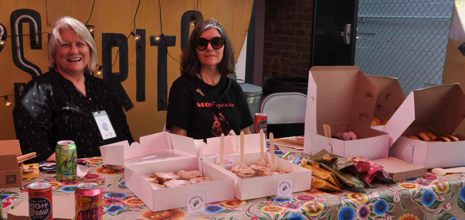In addition to the sign stuff, as promised, there was pie — tiny pies and donuts in the sign garden. That’s Randall Ann Homan on the left, one of the NeonSpeaks organizers who came down from San Francisco with hubby Al Barna: