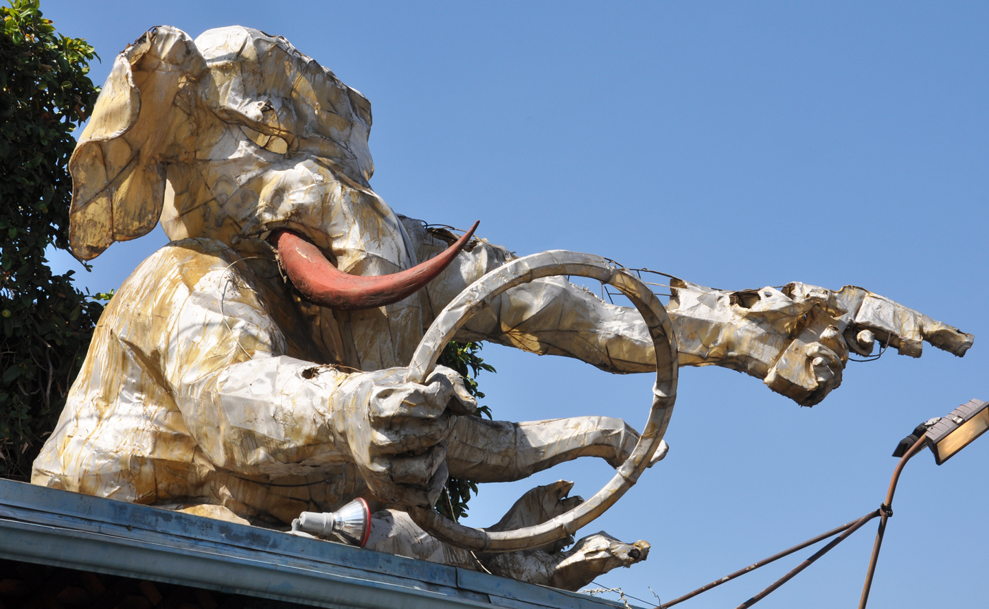 Let’s move on to some statues. This elephant is installed behind the Blue Room in Burbank. The gun is a reference to mass-shootings and the ring represents the Circle of Life: