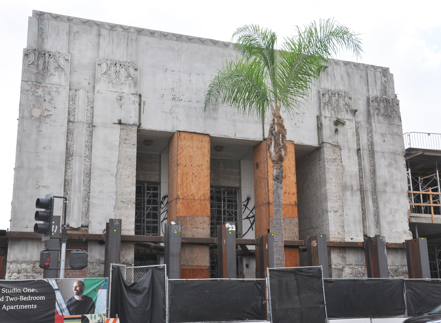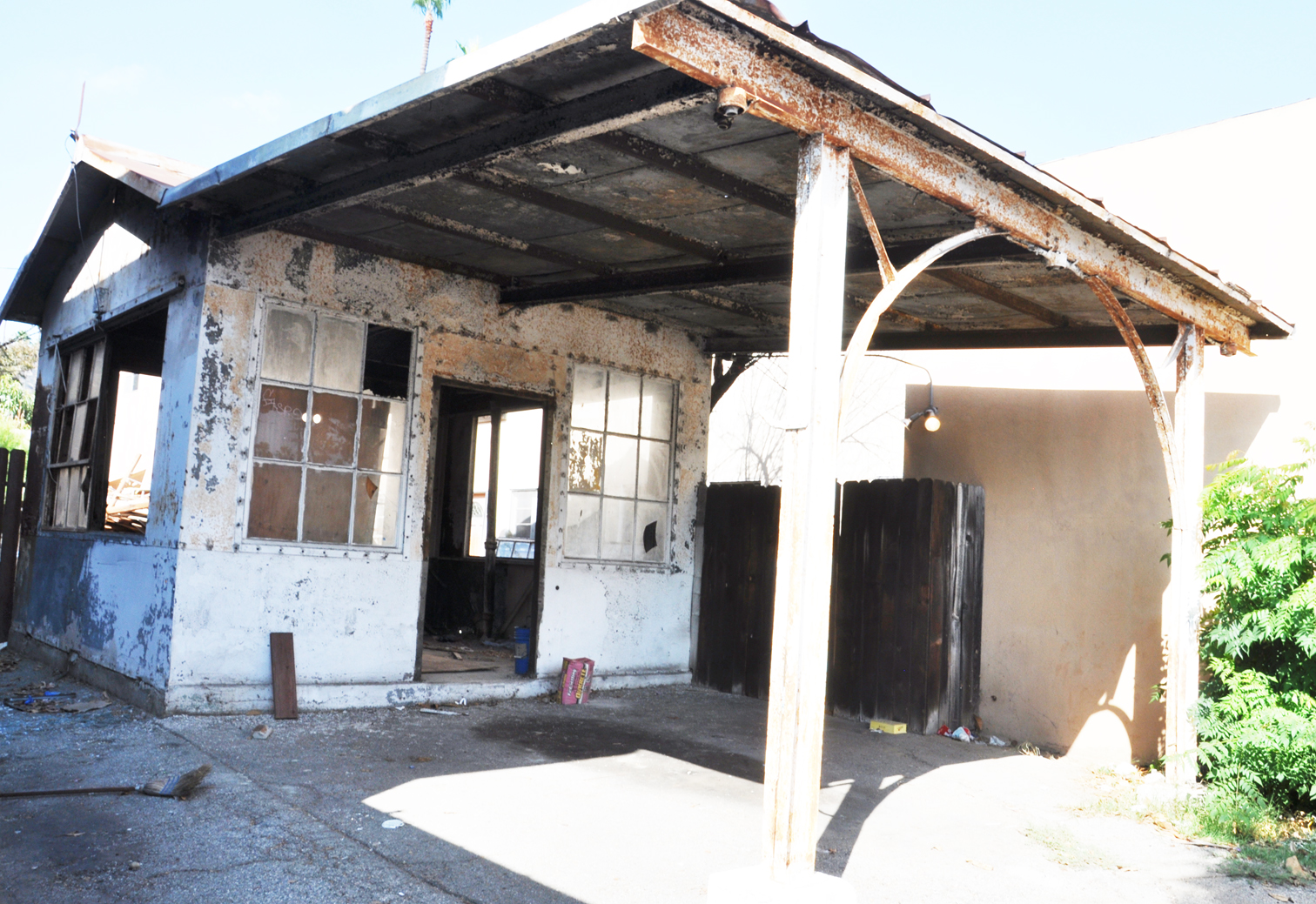 Let’s move on to some buildings. This prefabricated, metal gas station in Eagle Rock is from 1919. It seems doomed right now behind the tarped fence. A demo permit has been issued, however, local preservationists are still fighting the good fight: