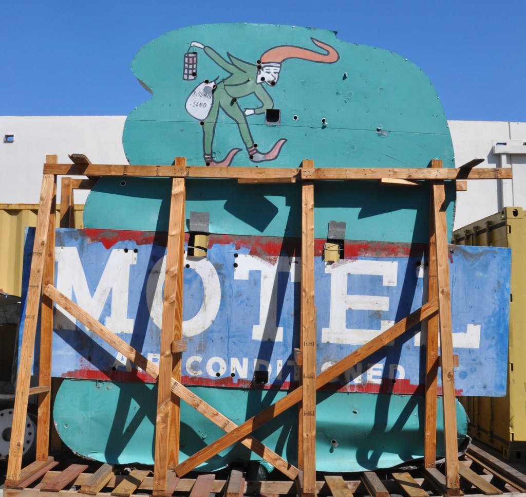 MONA recently acquired a few signs which had been languishing for decades in Anaheim’s city storage. The Sandman Motel sign is now at the museum’s storage facility in Pomona: