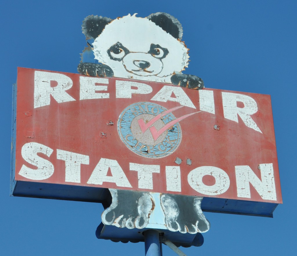 Here’s a cutie sign at Master Auto Repair in Pomona. At first, I thought it might be a “Happy Bear” (alignment bear) sign but the panels are not right. For example, those always have the bear’s but sticking out to one side: