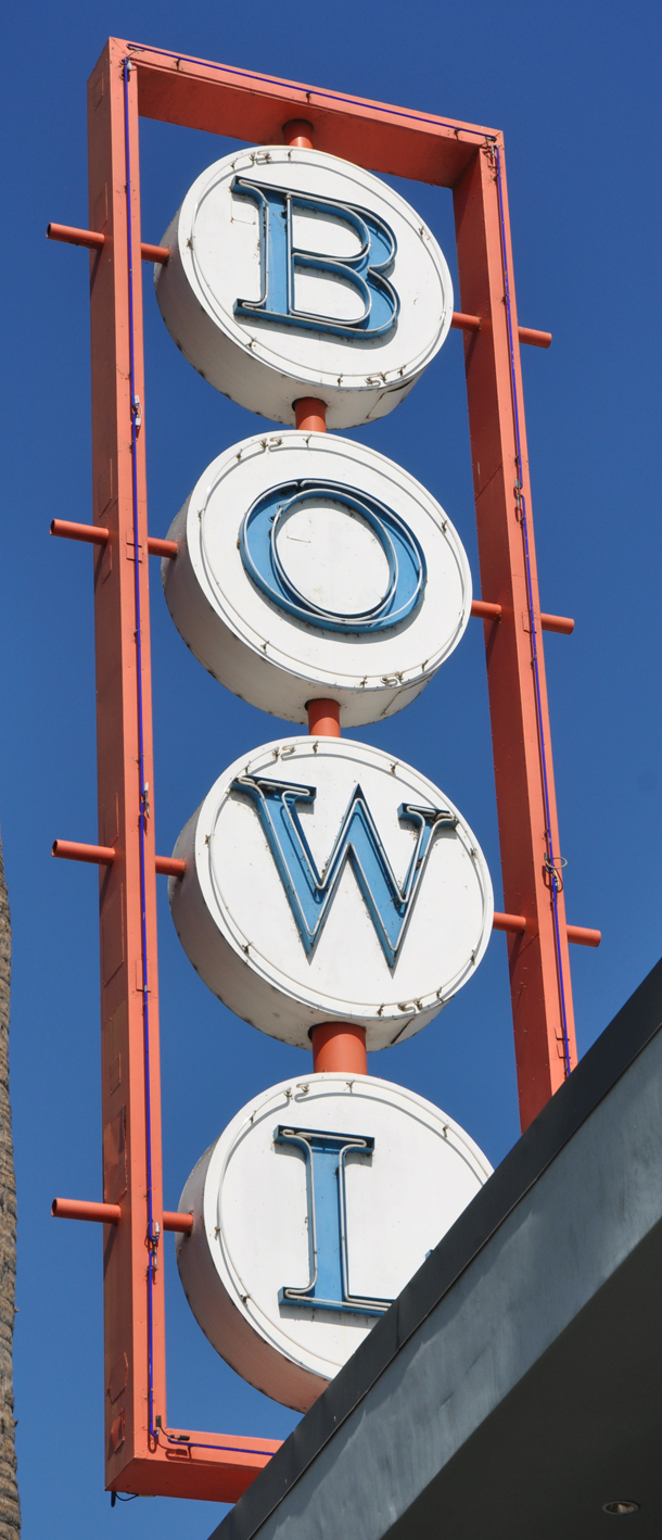 This sign in Studio City originally advertised for Joe Kirkwood Lanes which opened in 1958. The business is now the PINZ Entertainment Center: