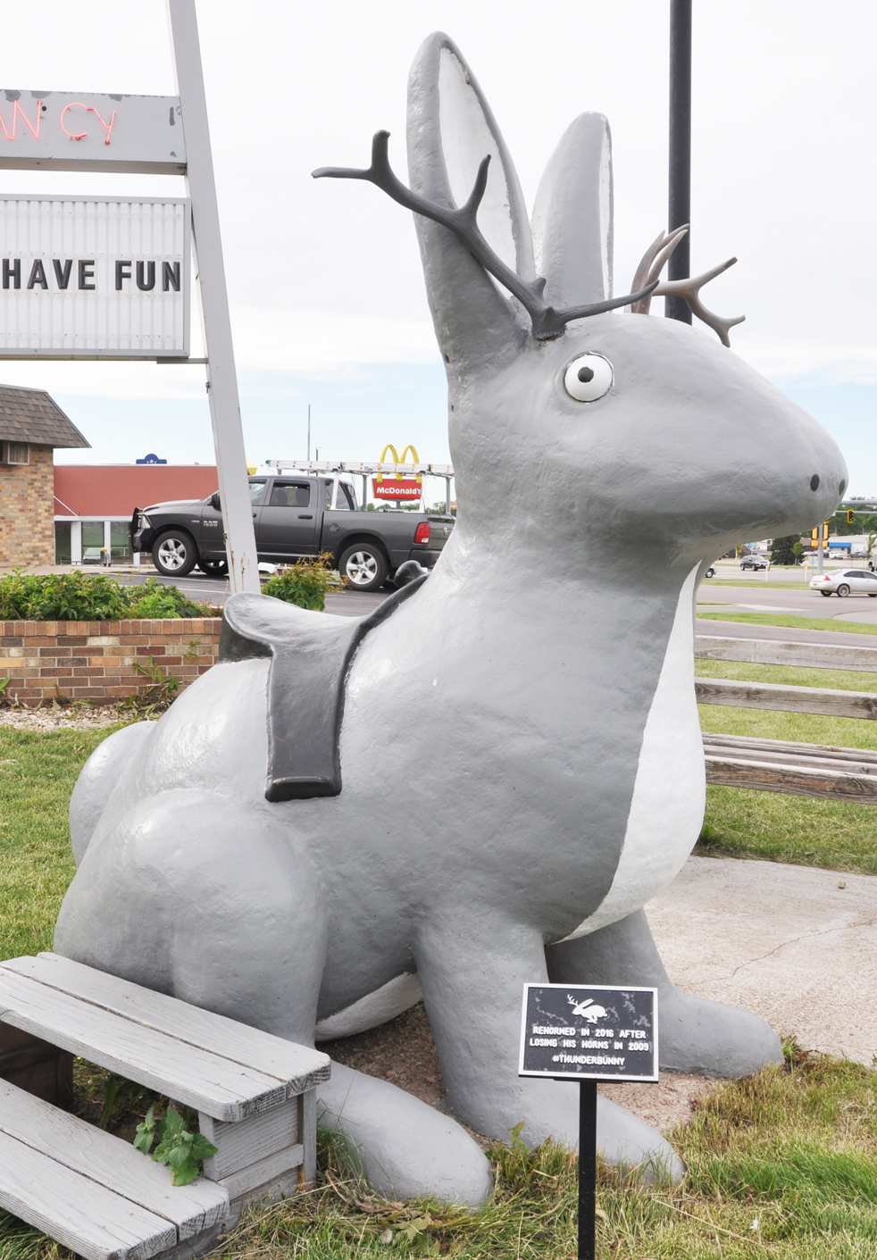 This Jackalope in Mitchell was missing his antlers for a while and there were signs not to sit on him. But he’s been restored and now they even have little steps so that you can pose for those photo-ops: