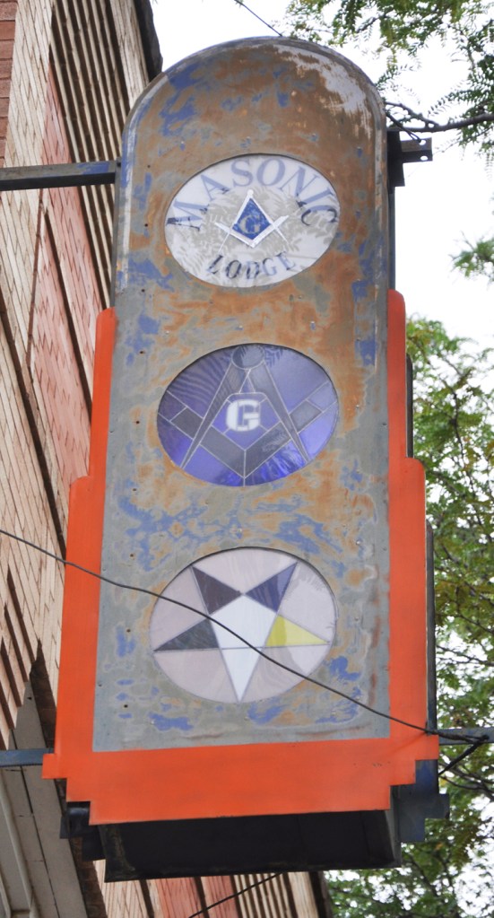 This Masonic Lodge sign, buried in the trees, is in Rocky Ford. It has backlit stained glass inserts: