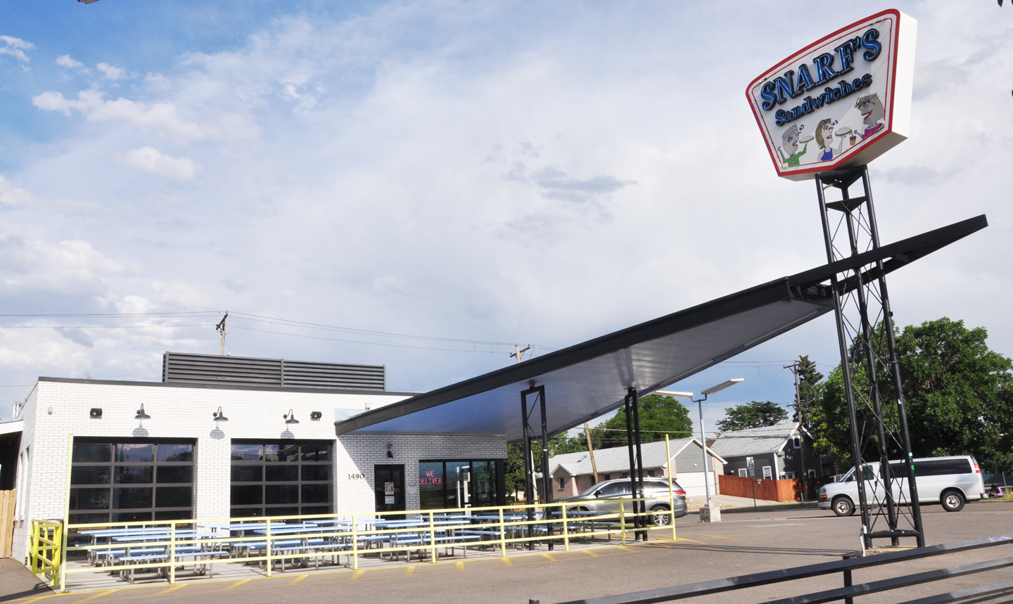 Lastly, a former Sinclair gas station (yes, the Phillips 66 design but they were Sinclairs in Colorado) in Denver that was adapted for the Snarf’s Sandwiches chain: