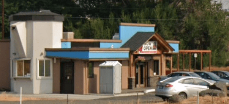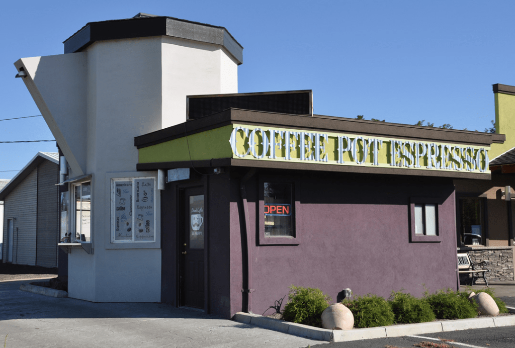 The Coffee Pot Espresso building in Gleed, WA now houses a pizza place. The drive-thru building has been expanded but the coffee pot is still there.