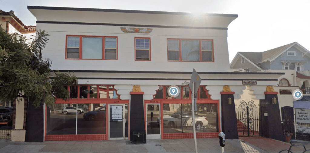 From the Egyptian Revival section… the Pharoah’s Court Apartment Building in San Diego, CA has been repainted — here’s what it looked like until earlier this year: