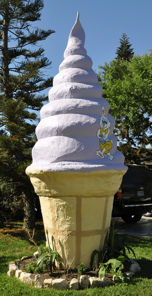 This giant ice cream cone was on a front lawn in Corpus Christi, TX since at least 2007. It was decorated and painted for different holidays. It’s gone now: